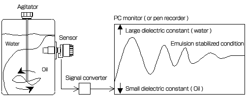 First, oil and water are separated each other. By agitating, emulsion particle sizes become smaller by agitation and finally becomes completely emulsified. By agitating, oil and water pass around the sensor alternately. As emulsion is advancing, change width (water dielectric constant is 80 and oil is 2 to 3) of output signal of dielectric constant is becoming smaller and smaller as shown in the screen at the upper right, and current emulsified status is measured. By this monitoring, we can judge whether we can stop agitation or nor.