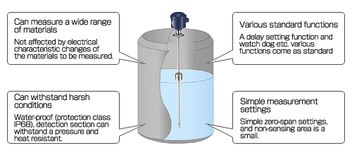 - Q. We are now using a float type level meter. It has a large non-sensing area on the rod and setting it is annoying and its measuring range is limited.