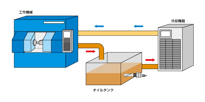 工作機械から出た「温度の高い油」をオイルタンクで回収し、油の状態をオイル劣化センサで検知して、冷却機器で「適切な温度の油」にして工作機械へ油を循環させます。油が劣化すると警報を出力します。