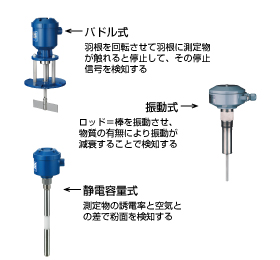 | 原理 | 羽根が先端についたシャフトを回転させ、測定物が羽根に触れると羽根が停止し、その停止を検知し検出信号を出力します。 | ロッド(棒)を特定の周波数で振動させ、測定物がロッドに触れると振動が減衰し、その減衰を検知し検出信号を出力します。 | 測定物の持っている誘電率と空気の誘電率との差を検知・計測して検出・計測信号を出力します。 | 超音波を発信し、粉面で反射した超音波を受信し、送信と受信の時間差を計測信号に変換して出力します。 |